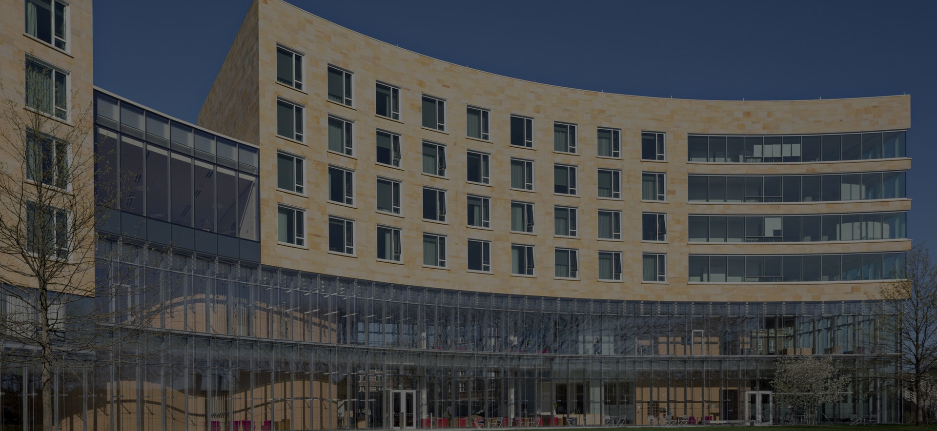 A person stands in front of a modern building with tan stone walls, large geometric supports, and many windows—an impressive contrast to traditional fabrication. Sunlight casts sharp shadows over the lawn and a few trees in the foreground.