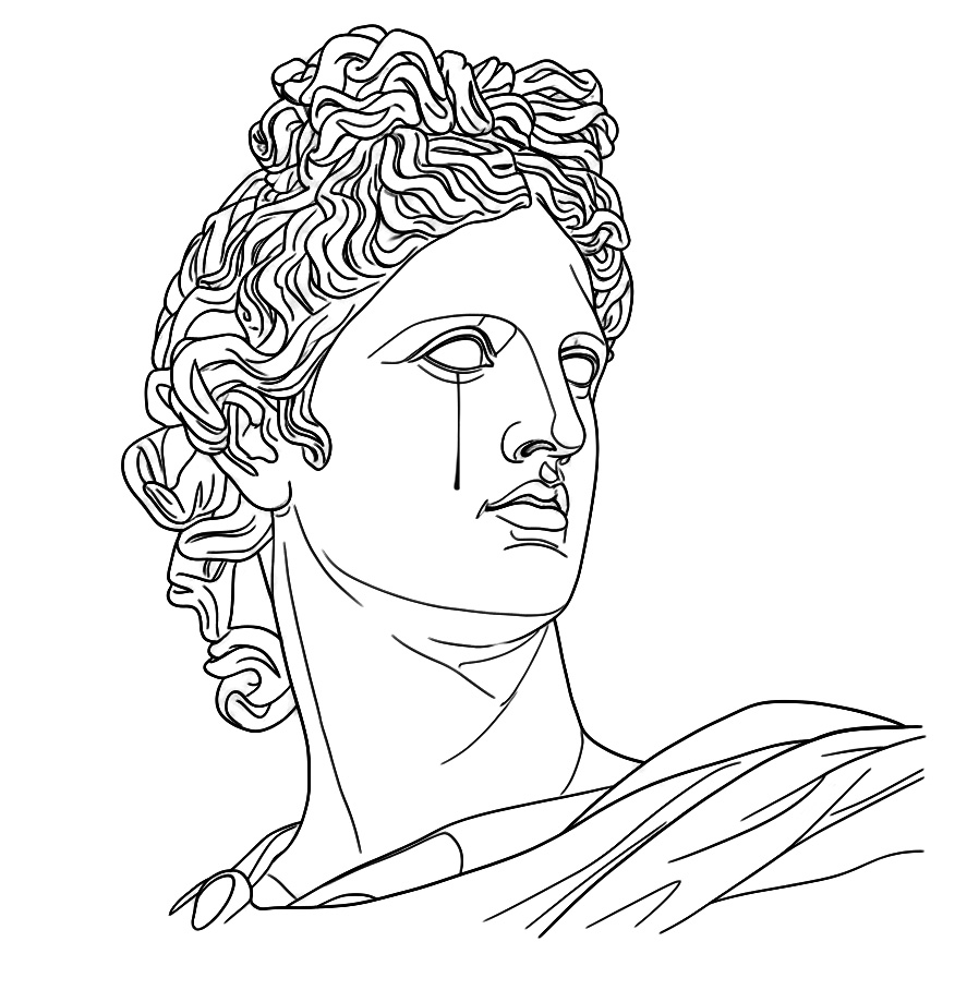 Line drawing of a classical statue’s head and shoulders with wavy hair, draped clothing, and a serious expression, featuring a single tear falling from one eye.