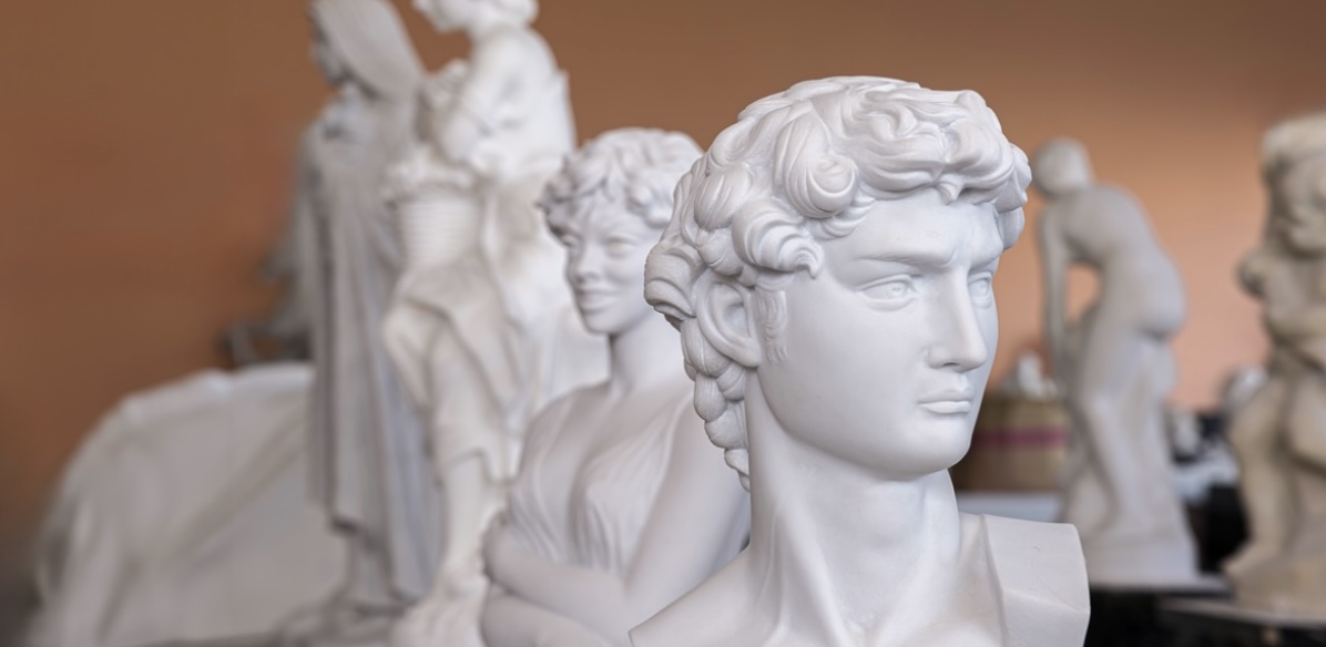 An elderly man, wearing a face mask and apron, carves a tall, textured sculpture resembling a historical figure in his workshop. Surrounded by tools, a yellow ladder, and red lockers in the well-lit industrial space, he crafts with precision and passion.